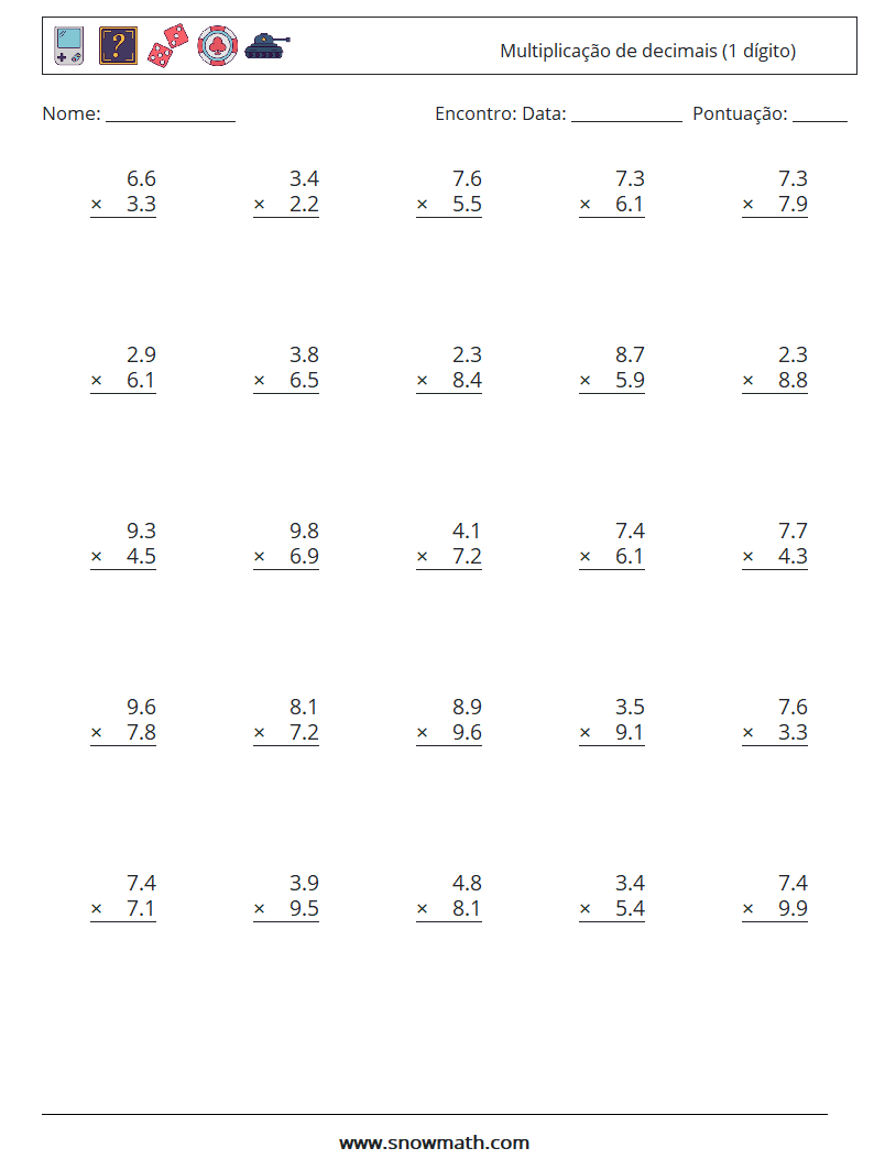 (25) Multiplicação de decimais (1 dígito) planilhas matemáticas 11