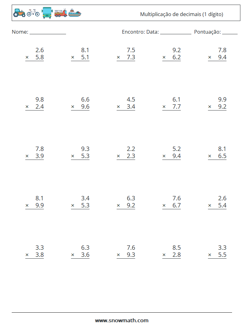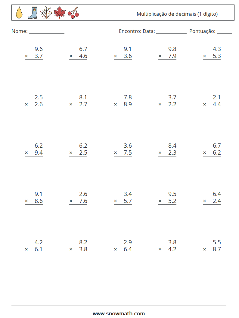 (25) Multiplicação de decimais (1 dígito) planilhas matemáticas 15
