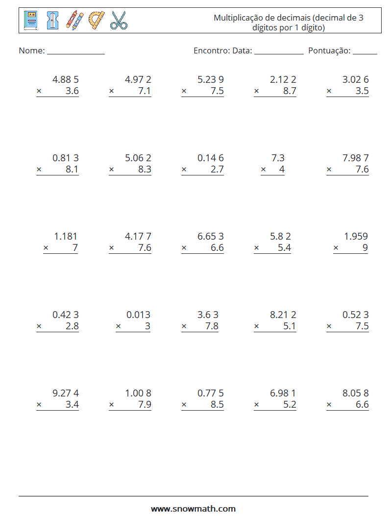 (25) Multiplicação de decimais (decimal de 3 dígitos por 1 dígito) planilhas matemáticas 5