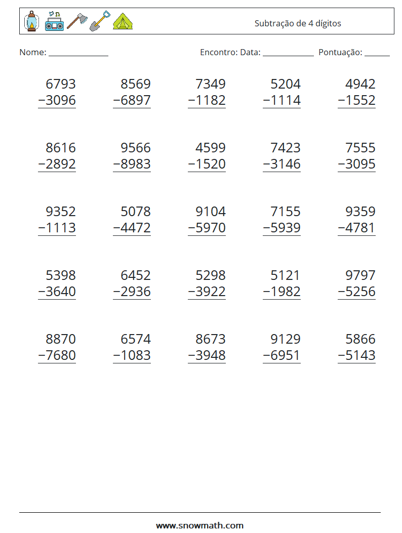 (25) Subtração de 4 dígitos planilhas matemáticas 5