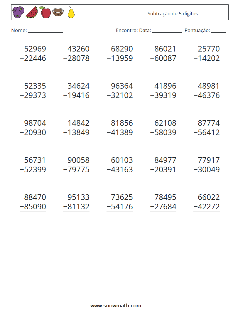 (25) Subtração de 5 dígitos planilhas matemáticas 17