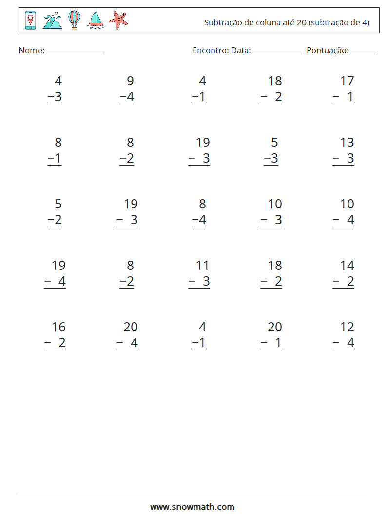 (25 questões de matemática) Subtração dentro de 20, subtração de 4, planilhas de matemática gratuitas.