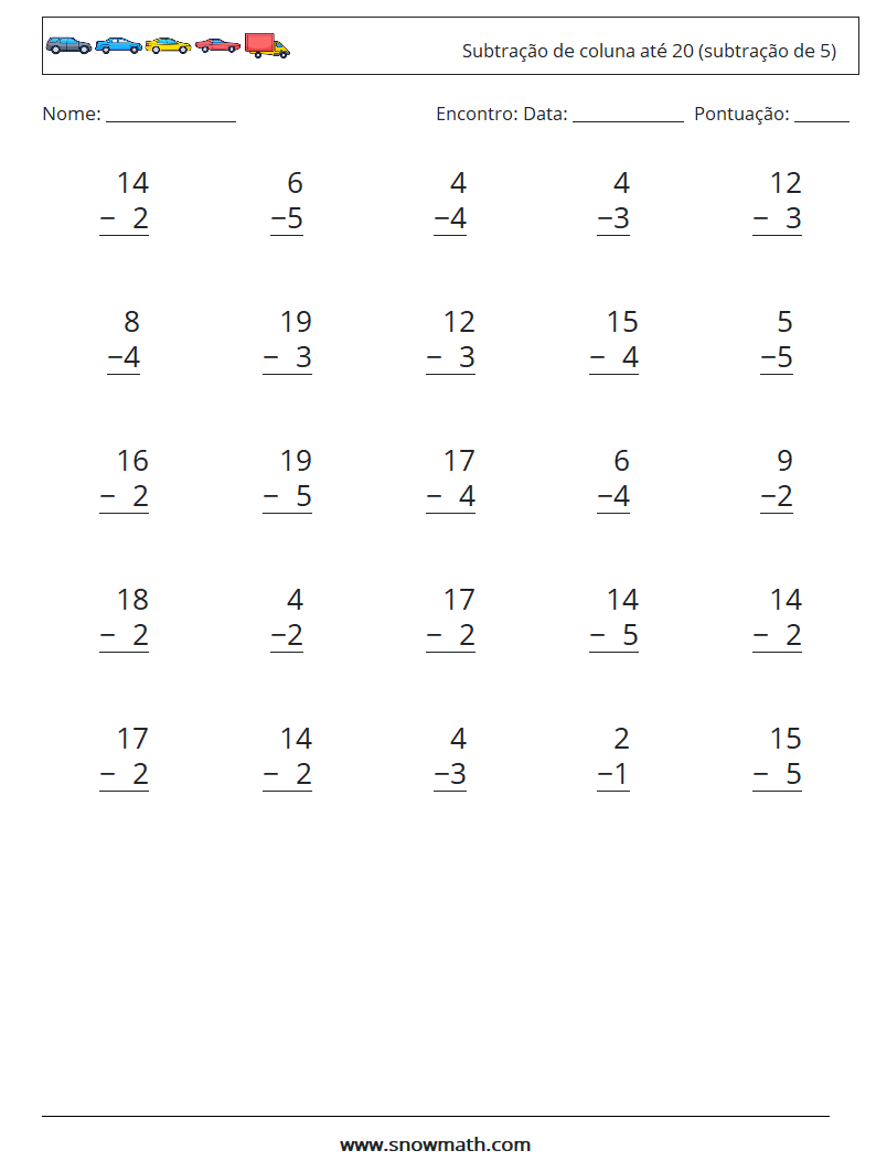 (25) Subtração de coluna até 20 (subtração de 5) planilhas matemáticas 5