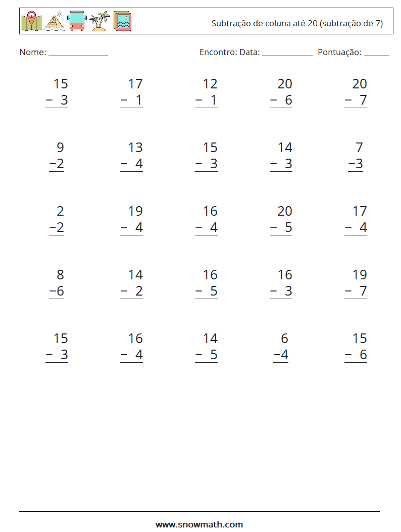 (25) Subtração de coluna até 20 (subtração de 7) planilhas matemáticas 15