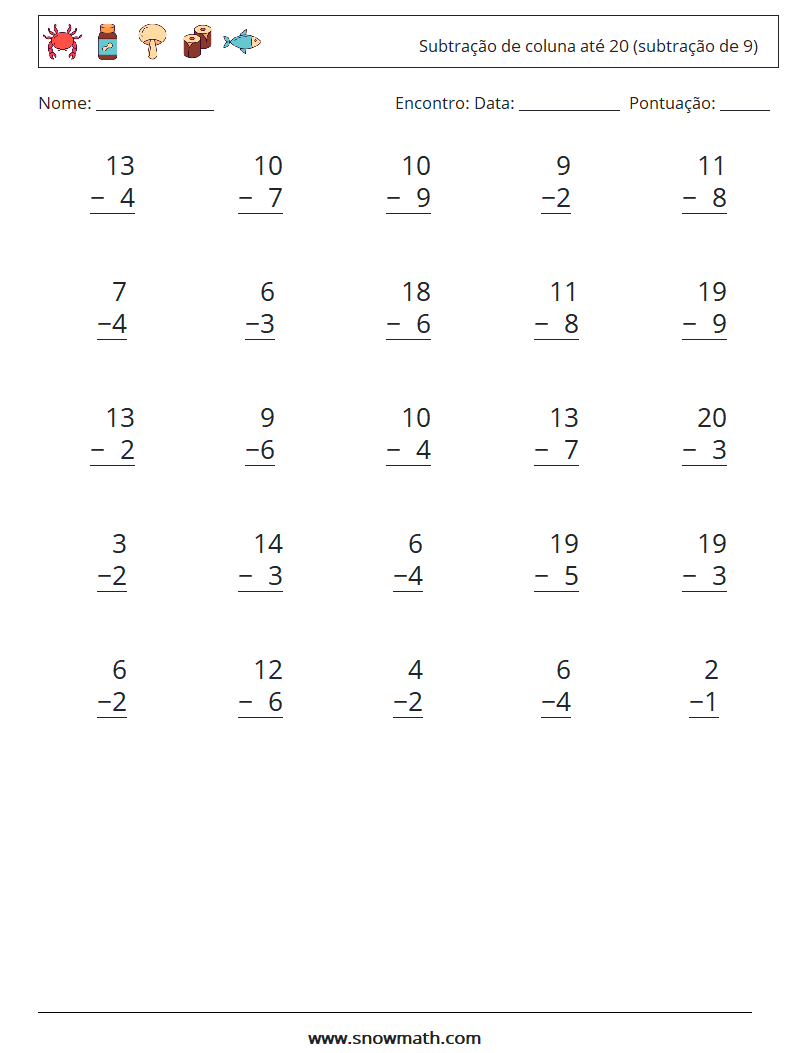 (25) Subtração de coluna até 20 (subtração de 9) planilhas matemáticas 5