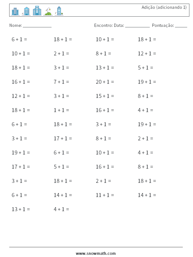 (50 questões de matemática) Adição dentro de 20, baixe planilhas de matemática grátis, adicionando 1