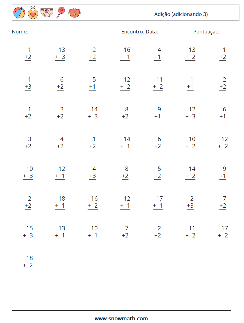 (50 questões matemáticas) Prática de adição até 20, somando 3