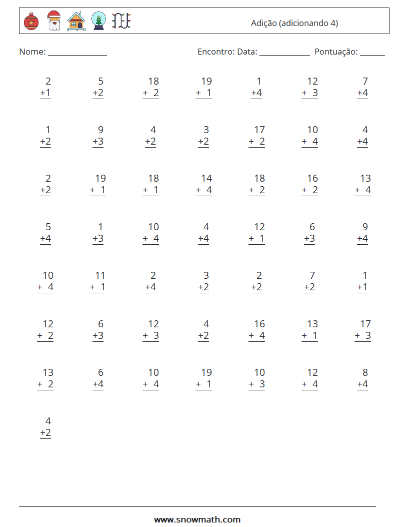 (50 questões matemáticas) Prática de adição até 20, adicionando 4