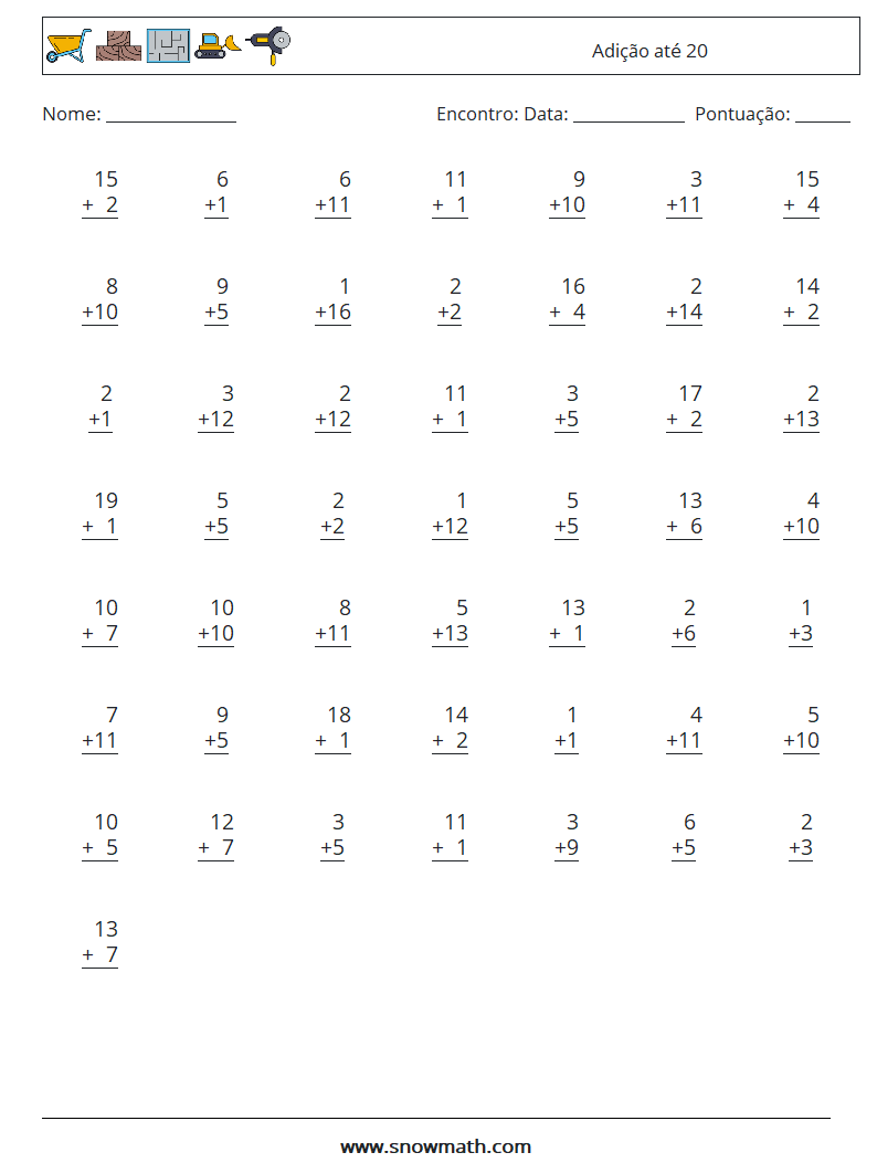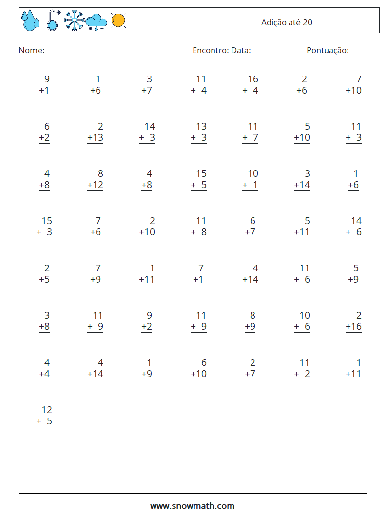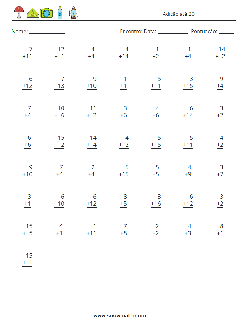 (50 questões de matemática) Prática de adição até 20, baixar planilhas de matemática.