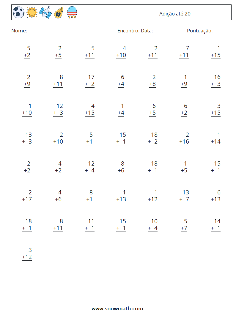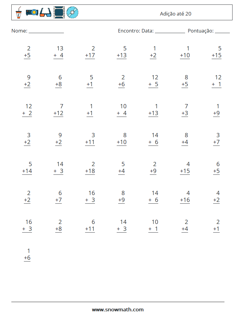 (50 questões de matemática) Prática de adição até 20, baixar planilhas de matemática.