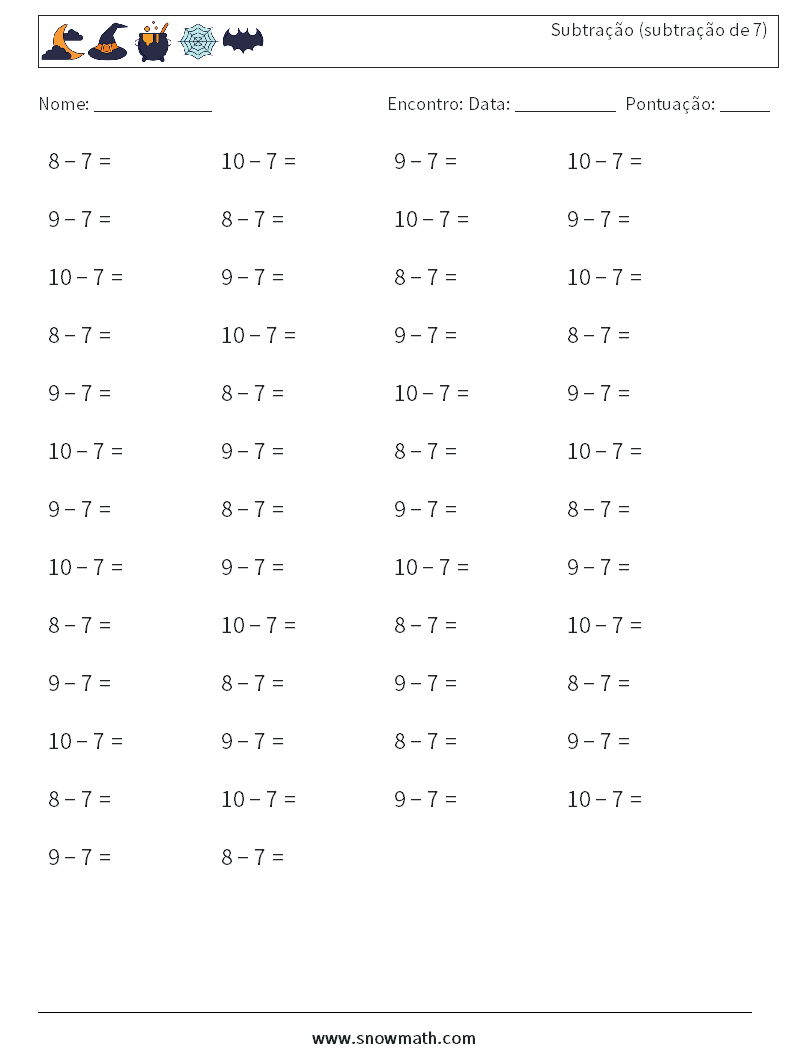 (50 questões de matemática) Pratique a subtração, subtração de 7, planilhas de matemática.