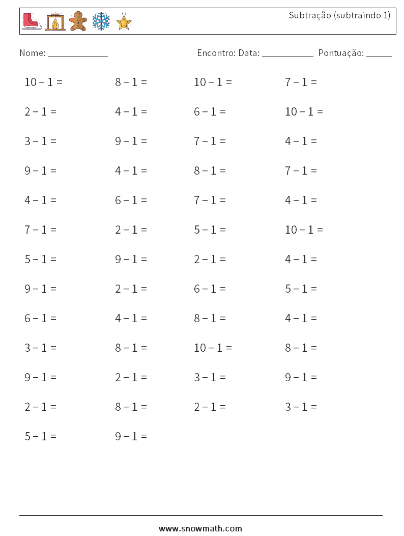 (50) Subtração (subtraindo 1) planilhas matemáticas 9