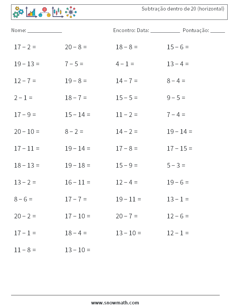 (50) Subtração dentro de 20 (horizontal) planilhas matemáticas 1