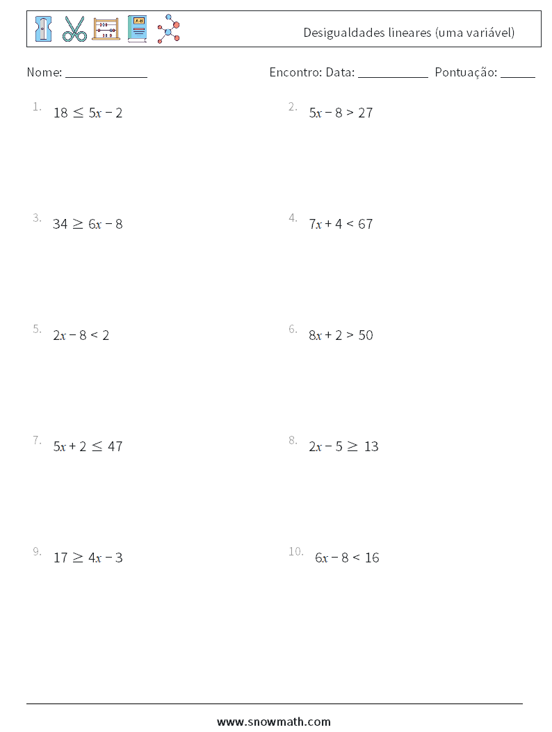 Desigualdades lineares (uma variável) planilhas matemáticas 9