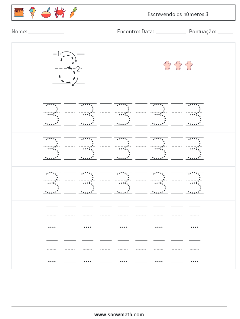 Aprenda a escrever o número 3, planilhas de matemática para impressão
