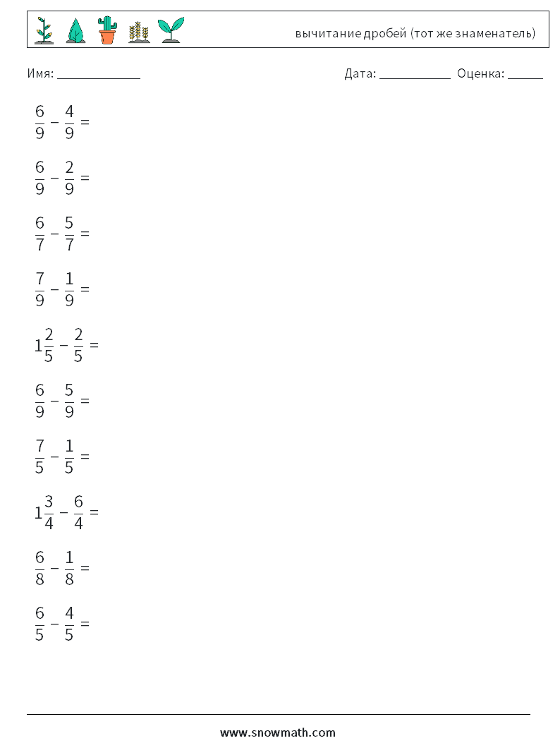 (10) вычитание дробей (тот же знаменатель) Рабочие листы по математике 10