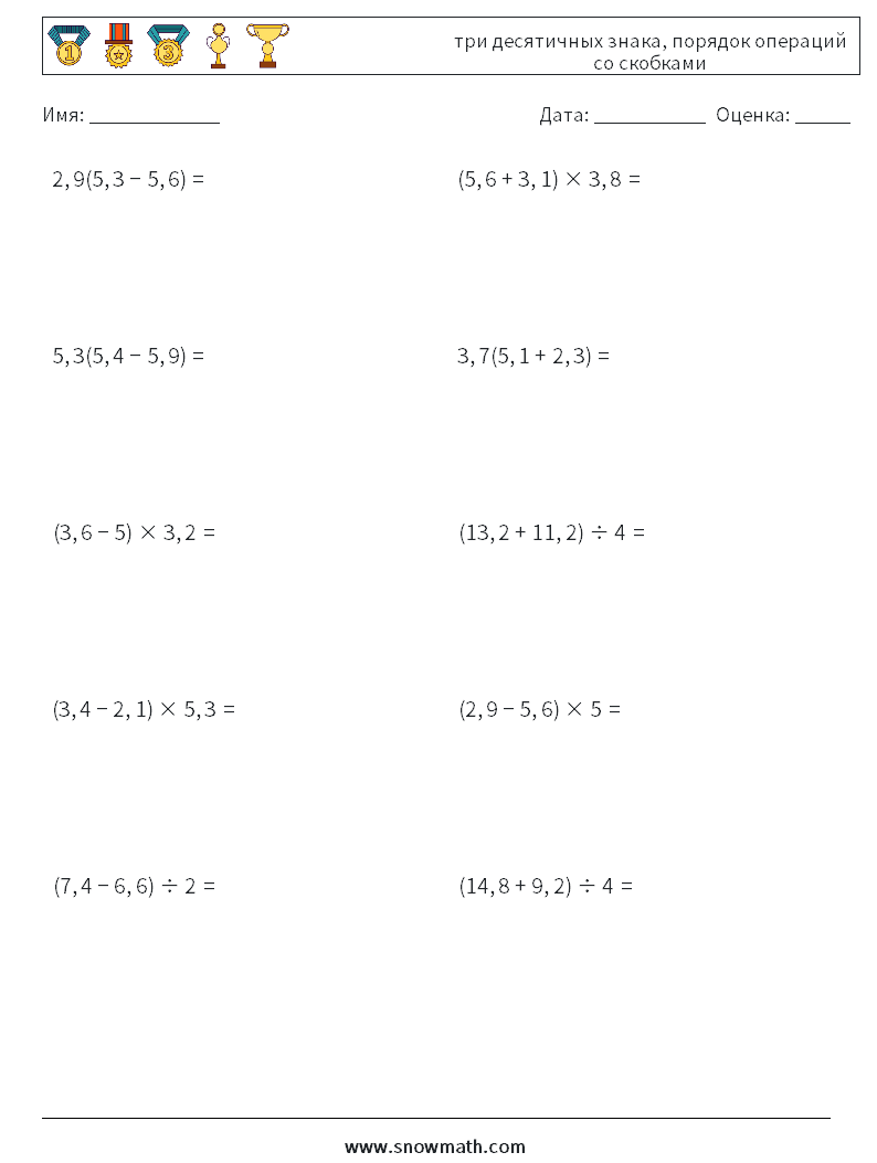 (10) три десятичных знака, порядок операций со скобками Рабочие листы по математике 10