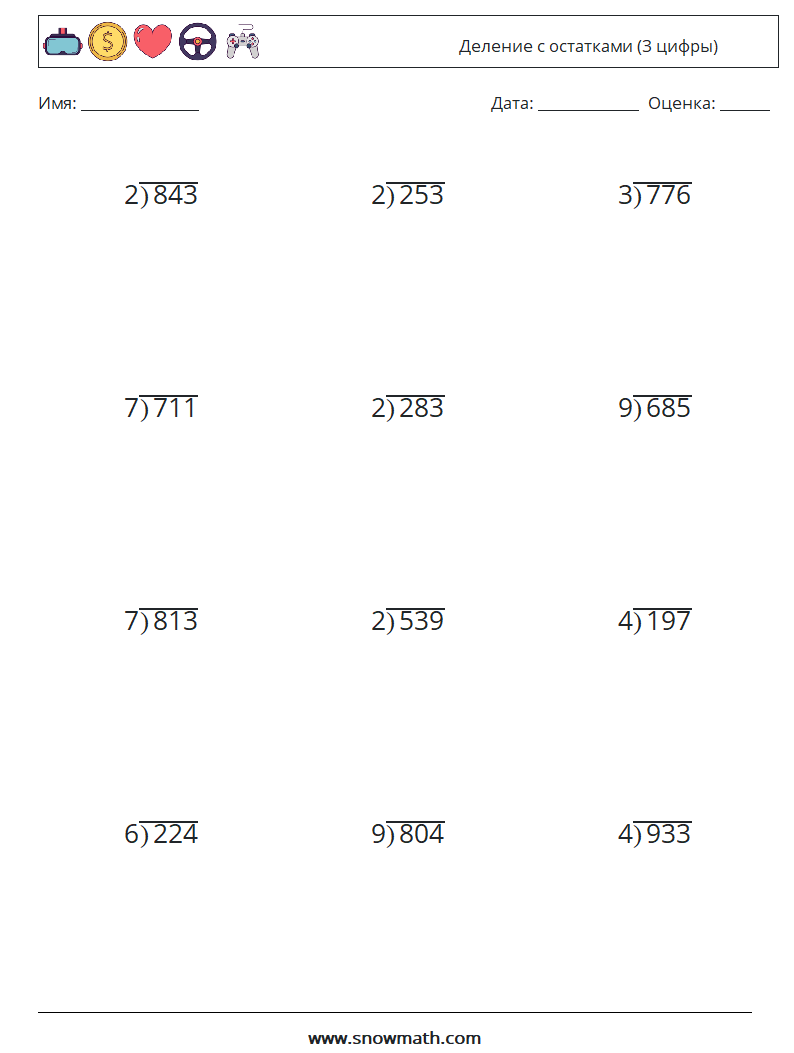 (12) Деление с остатками (3 цифры) Рабочие листы по математике 12