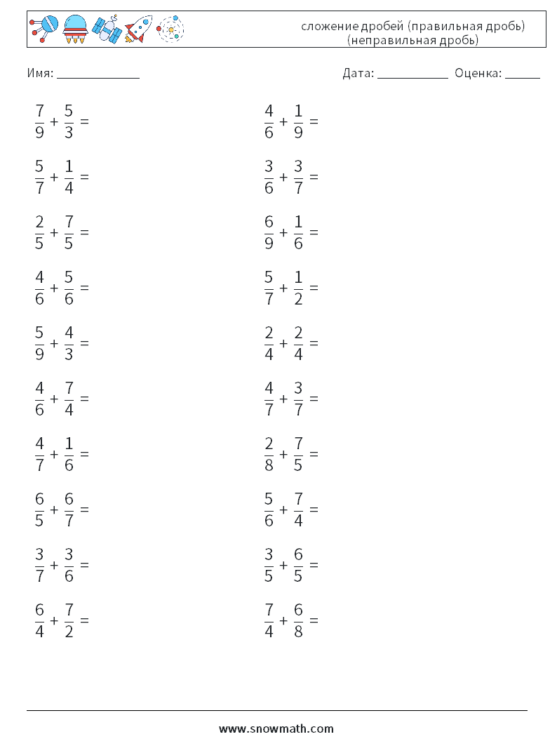 (20) сложение дробей (правильная дробь) (неправильная дробь) Рабочие листы по математике 11