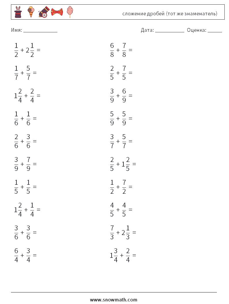 (20) сложение дробей (тот же знаменатель) Рабочие листы по математике 1