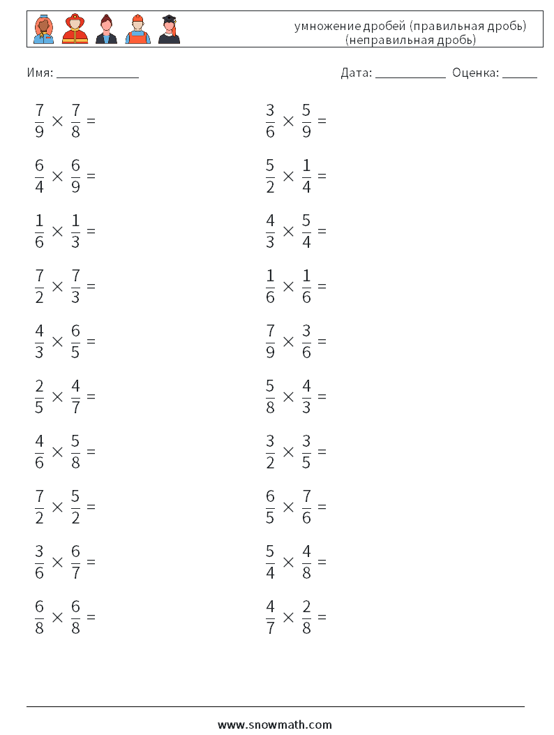 (20) умножение дробей (правильная дробь) (неправильная дробь) Рабочие листы по математике 1