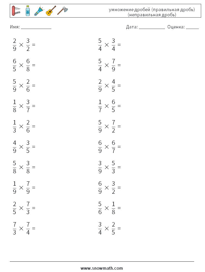 (20) умножение дробей (правильная дробь) (неправильная дробь) Рабочие листы по математике 11