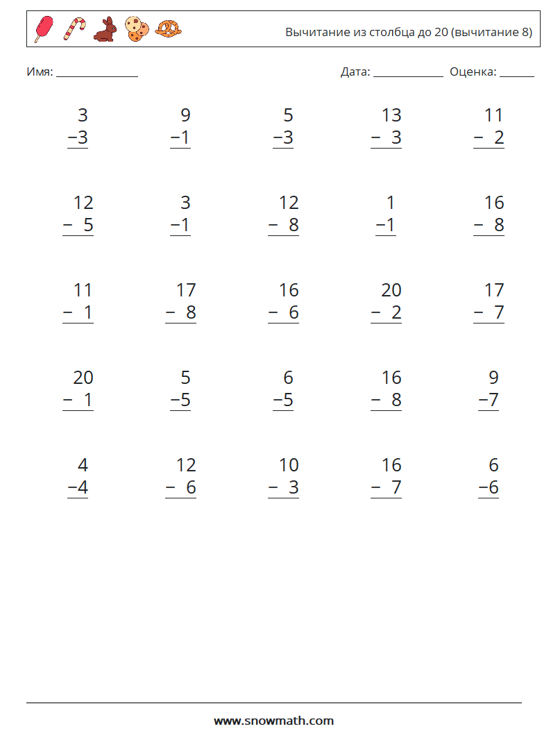 (25 вопросов по математике) Практика вычитания до 20, вычитание 8, рабочие листы по математике.