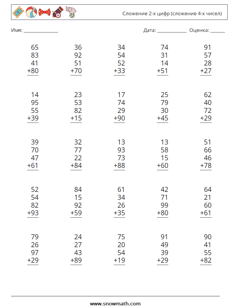 (25 вопросов по математике) Изучите сложение, сложение четырех двузначных чисел, распечатанные математические листы.