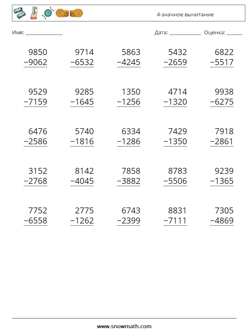 (25) 4-значное вычитание Рабочие листы по математике 4