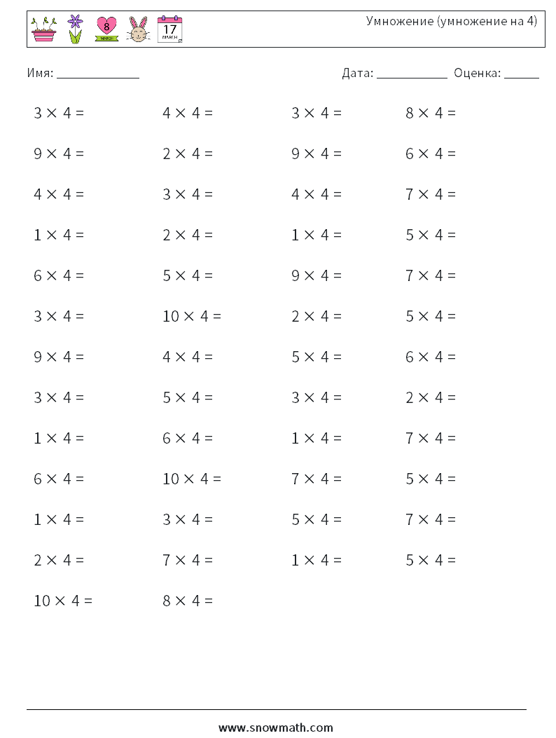 (50) Умножение (умножение на 4) Рабочие листы по математике 1