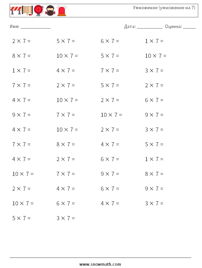 (50) Умножение (умножение на 7) Рабочие листы по математике 1