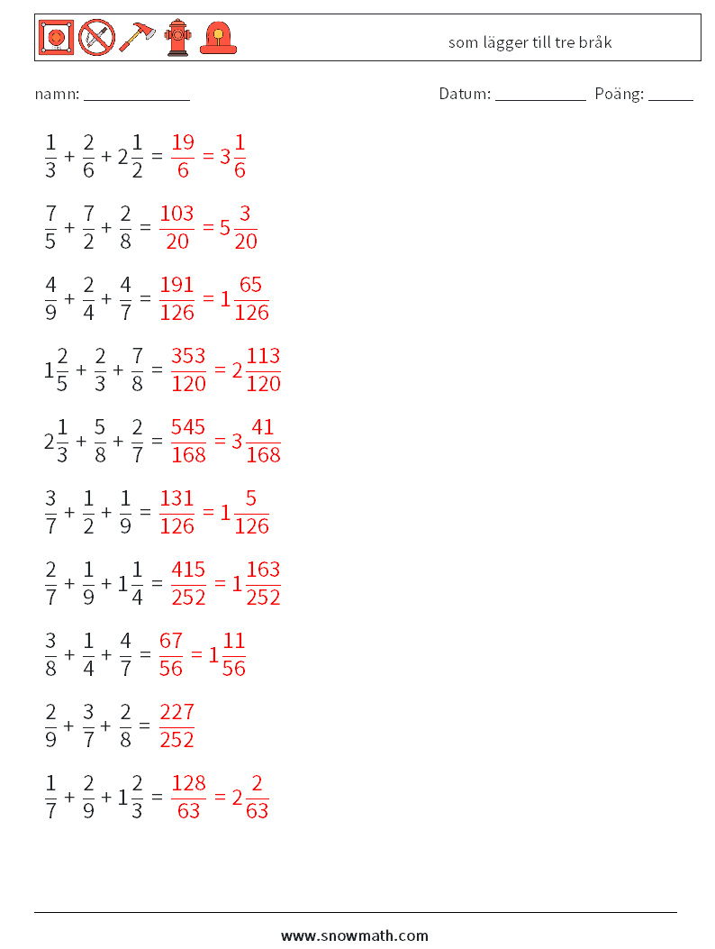 (10) som lägger till tre bråk