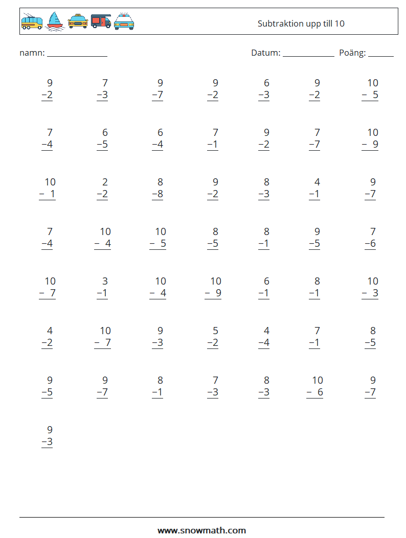 (50) Subtraktion upp till 10 Matematiska arbetsblad 7