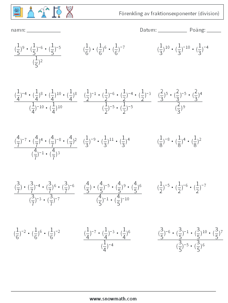 Förenkling av fraktionsexponenter (division) Matematiska arbetsblad 6