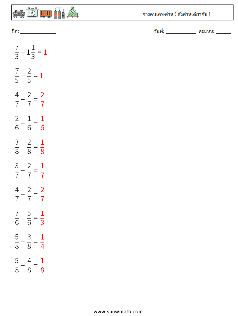 (10) การลบเศษส่วน ( ตัวส่วนเดียวกัน )