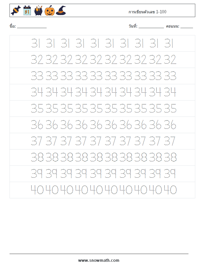 การเขียนตัวเลข 1-100 ใบงานคณิตศาสตร์ 9