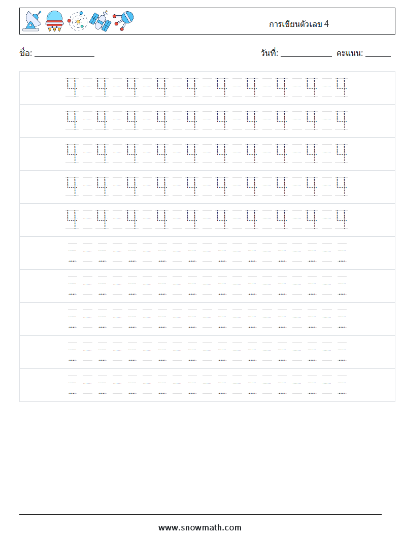 การเขียนตัวเลข 4 ใบงานคณิตศาสตร์ 10