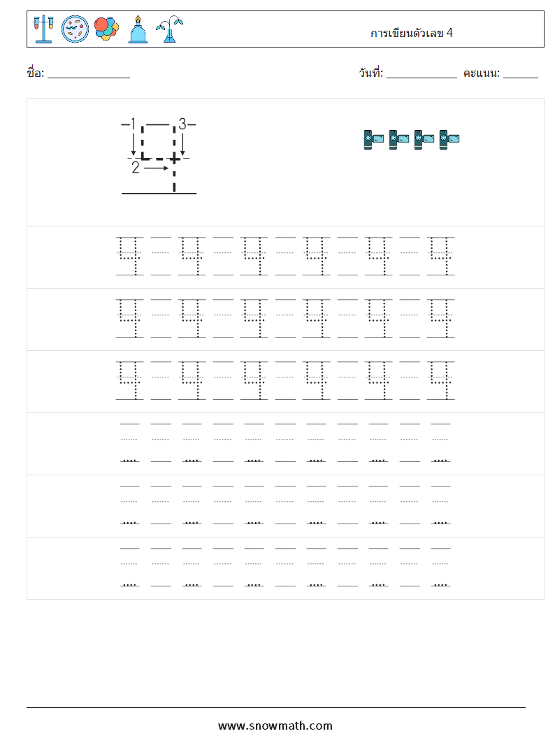 เรียนรู้วิธีเขียนเลข 4 แบบฝึกหัดคณิตศาสตร์ฟรี