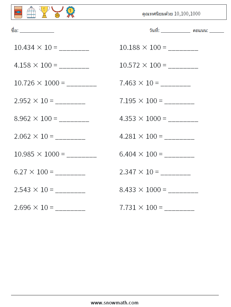 คูณทศนิยมด้วย 10,100,1000 แผ่นงานคณิตศาสตร์ฟรี
