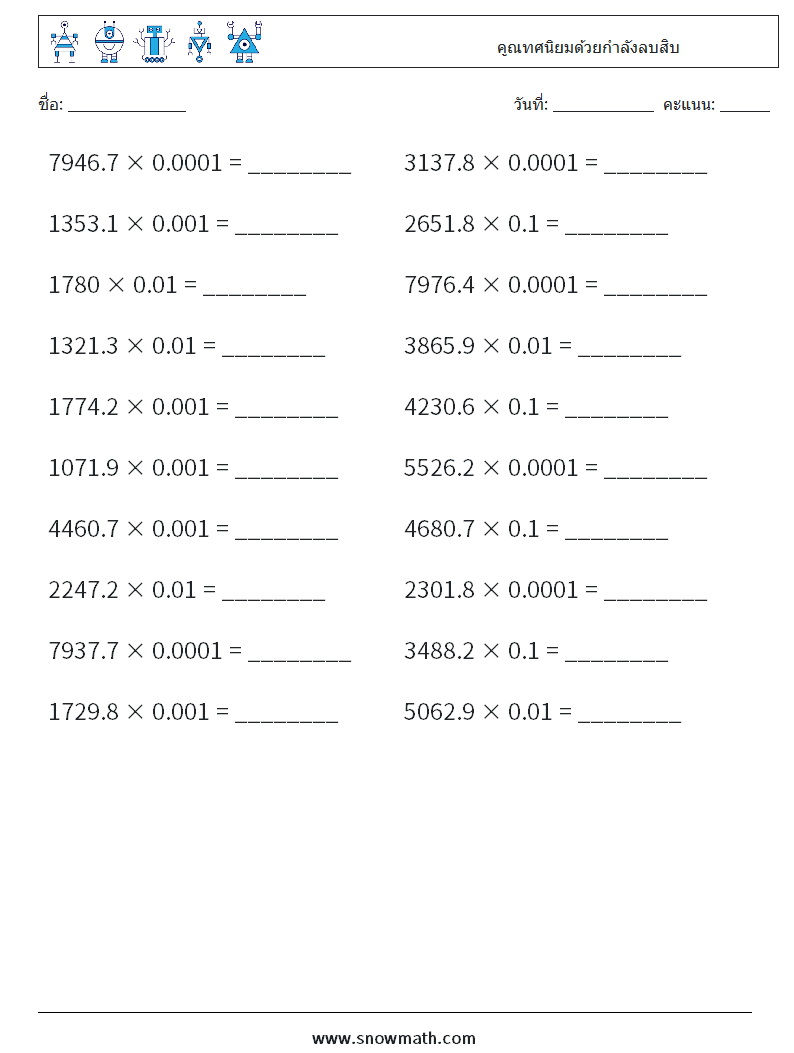 คูณทศนิยมด้วยกำลังลบสิบ ใบงานคณิตศาสตร์ 2
