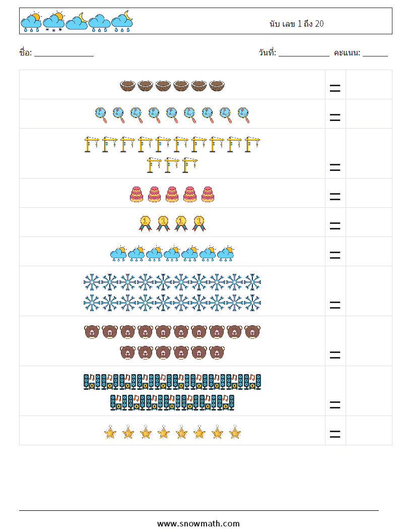 นับ เลข 1 ถึง 20 ใบงานคณิตศาสตร์ 10