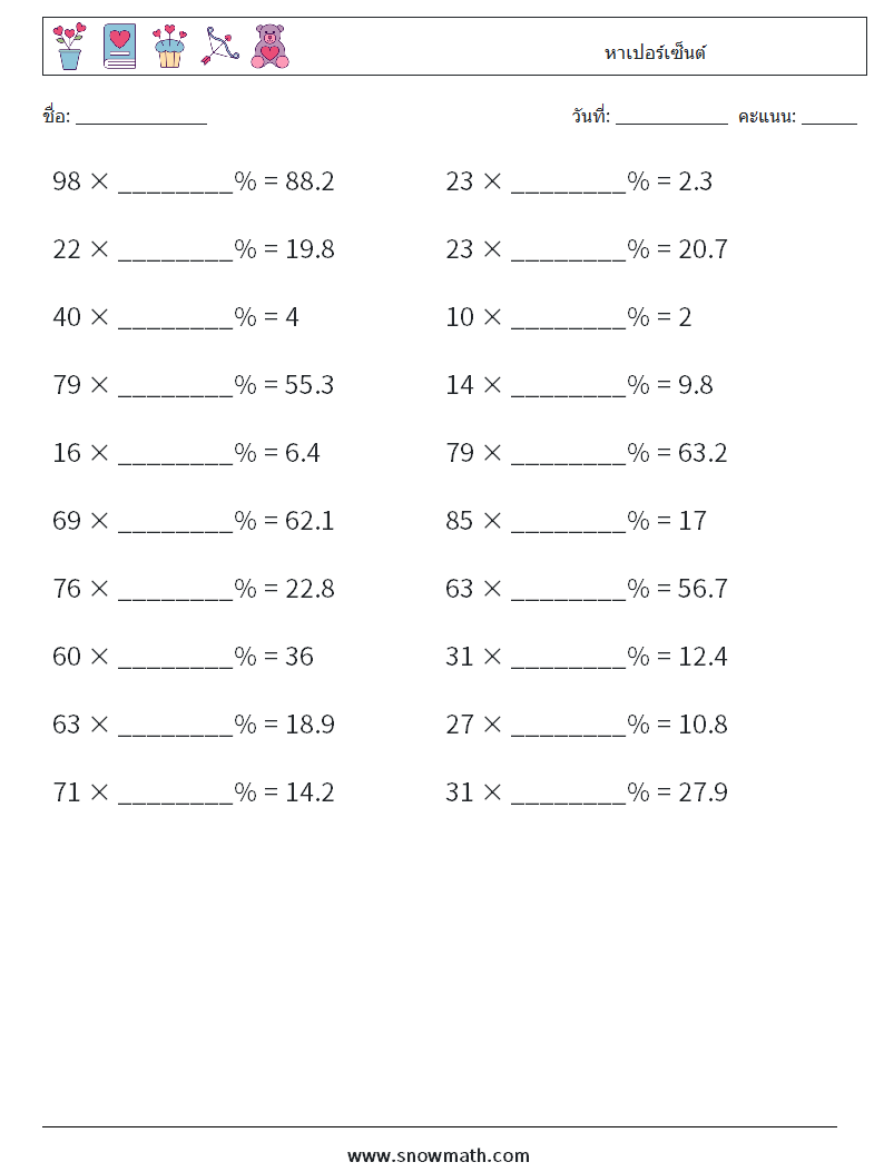 ค้นหาเปอร์เซ็นต์ แผ่นงานคณิตศาสตร์ฟรี