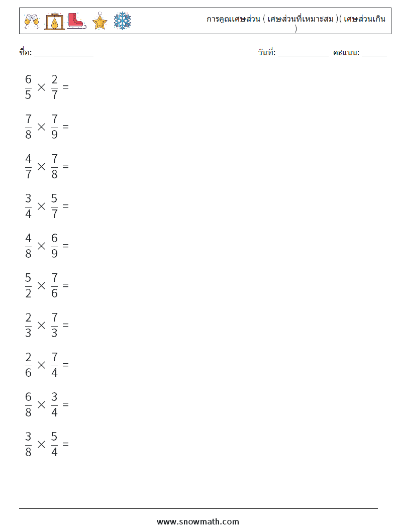 (10) การคูณเศษส่วน ( เศษส่วนที่เหมาะสม )( เศษส่วนเกิน ) ใบงานคณิตศาสตร์ 1