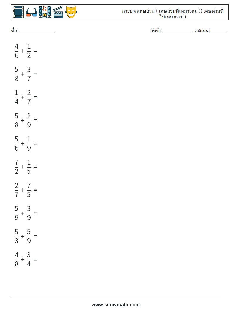 (10) การบวกเศษส่วน ( เศษส่วนที่เหมาะสม )( เศษส่วนที่ไม่เหมาะสม ) ใบงานคณิตศาสตร์ 5