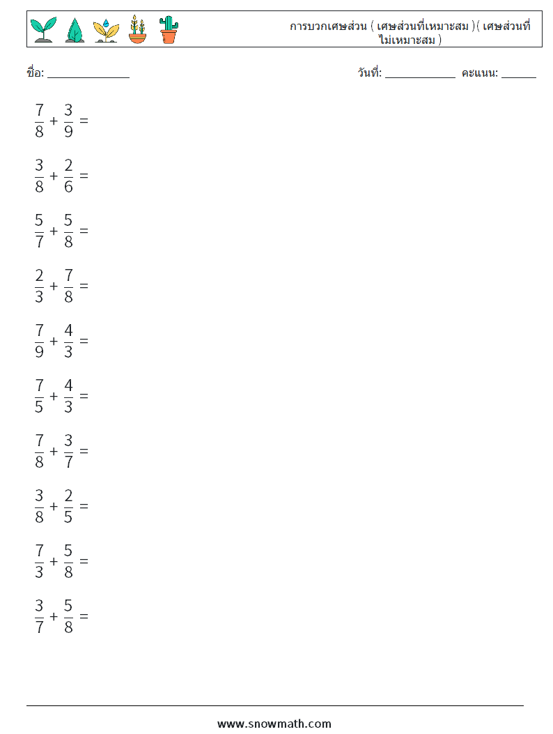 (10) การบวกเศษส่วน ( เศษส่วนที่เหมาะสม )( เศษส่วนที่ไม่เหมาะสม ) ใบงานคณิตศาสตร์ 10