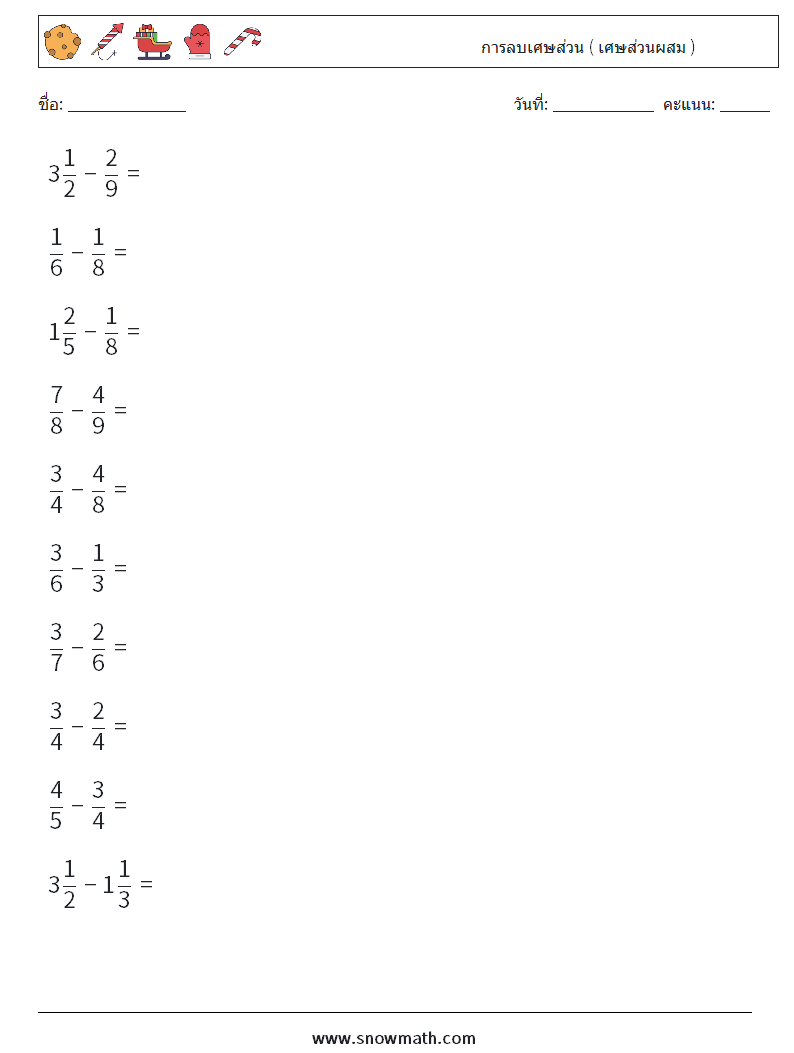 (10) การลบเศษส่วน ( เศษส่วนผสม ) ใบงานคณิตศาสตร์ 12