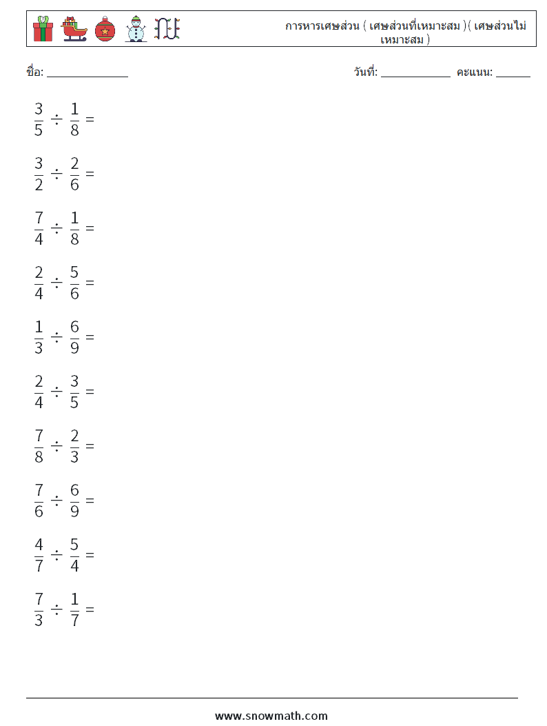 (10) การหารเศษส่วน ( เศษส่วนที่เหมาะสม )( เศษส่วนไม่เหมาะสม ) ใบงานคณิตศาสตร์ 3