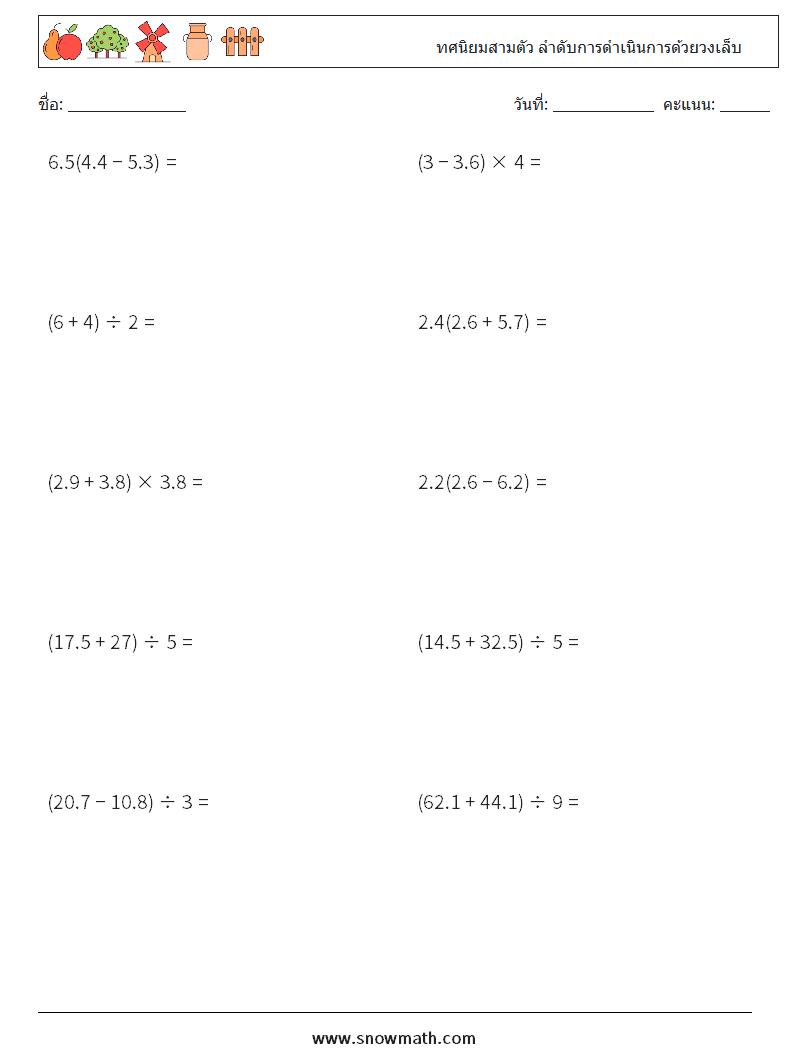 (10) ทศนิยมสามตัว ลำดับการดำเนินการด้วยวงเล็บ ใบงานคณิตศาสตร์ 3