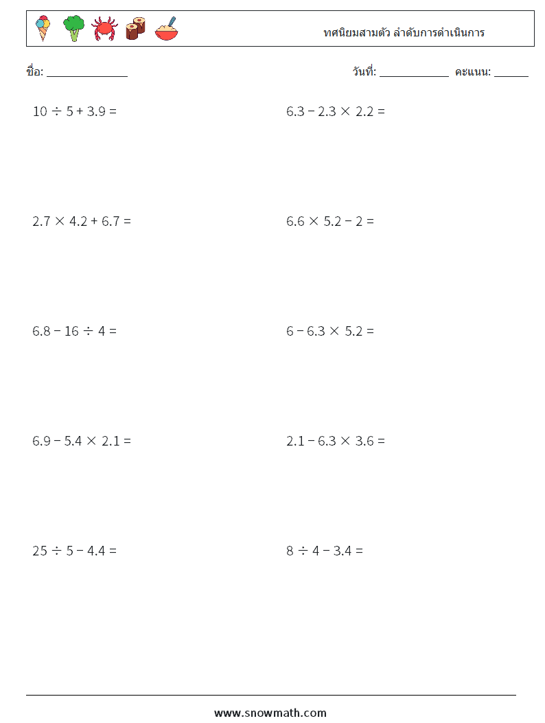 (10) ทศนิยมสามตัว ลำดับการดำเนินการ ใบงานคณิตศาสตร์ 10