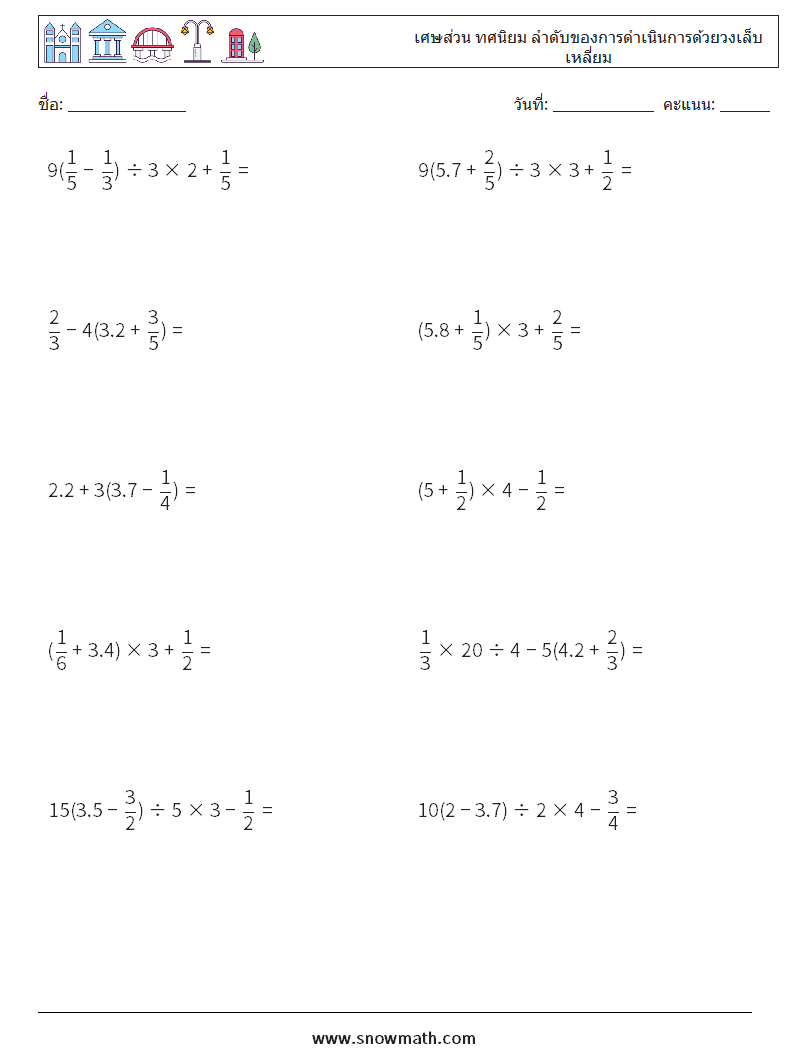 (10) เศษส่วน ทศนิยม ลำดับของการดำเนินการด้วยวงเล็บเหลี่ยม ใบงานคณิตศาสตร์ 10